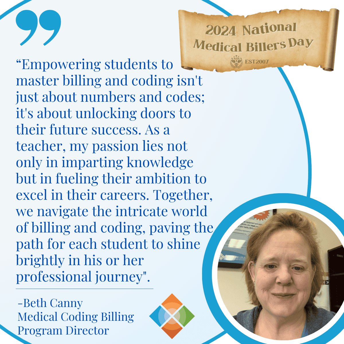 “Empowering students to learn billing and coding isn’t just about numbers and codes; it’s about unlocking doors to their future endeavors. As a teacher, my passion lies not only in imparting knowledge but in fueling their ambition to excel in their careers. Together, we navigate the intricate world of billing and coding, paving the path for each student to shine brightly in his or her professional journey,” shared Beth Canny, Medical Coding & Billing Program Director.